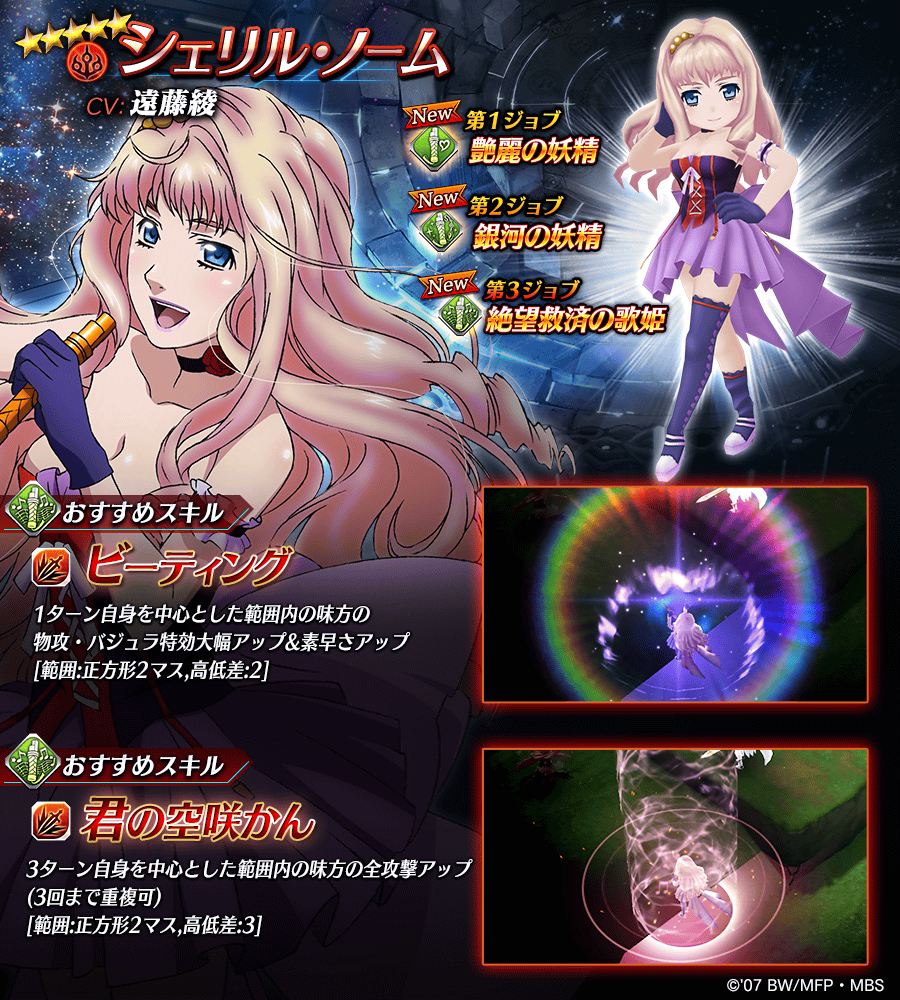| ビーティング | 1ターン自身を中心とした範囲内の味方の物攻・バジュラ特効大幅アップ&素早さアップ [範囲:正方形2マス,高低差:2] |