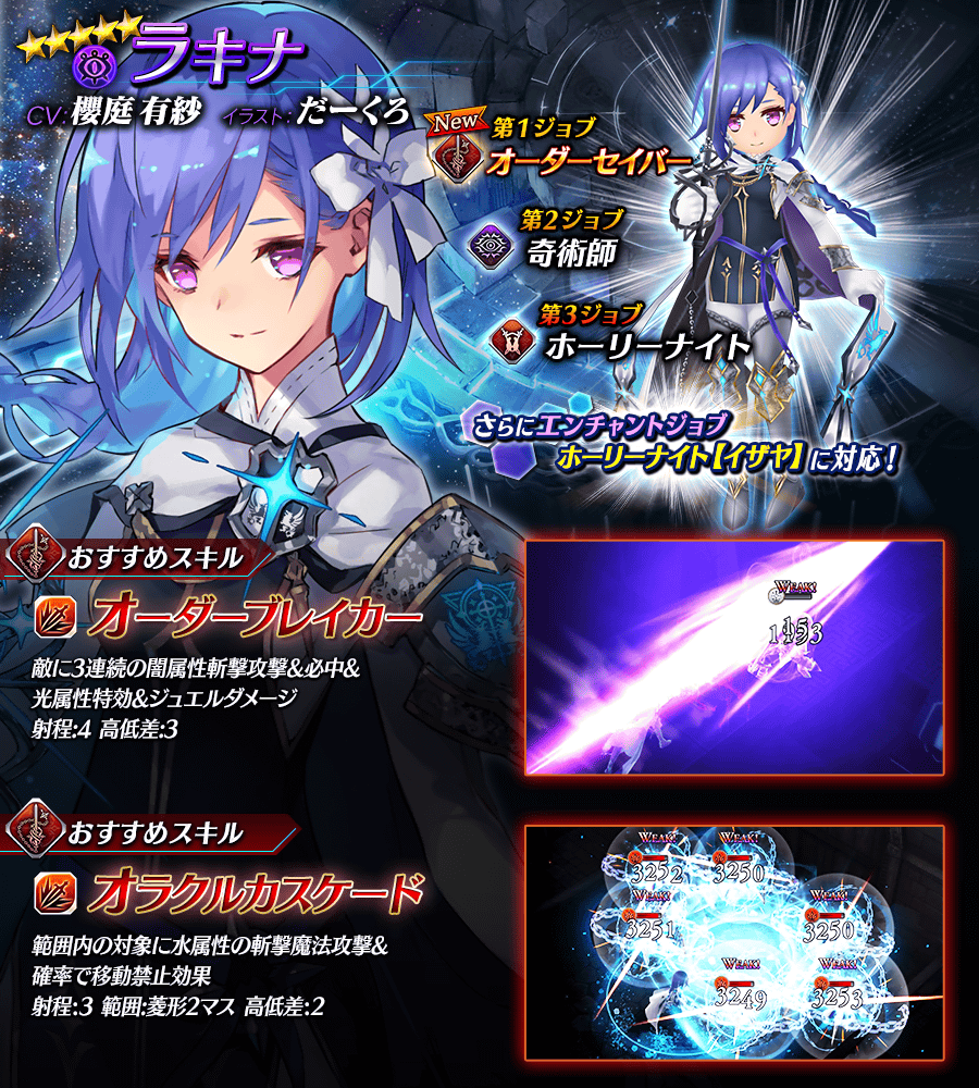 | オーダーブレイカー | 敵に3連続の闇属性斬撃攻撃&必中&光属性特効&ジュエルダメージ [射程:4,高低差:3] |