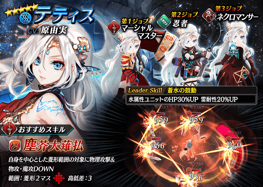 | リーダースキル | 水属性ユニットのHP30%UP,雷耐性20%UP |
